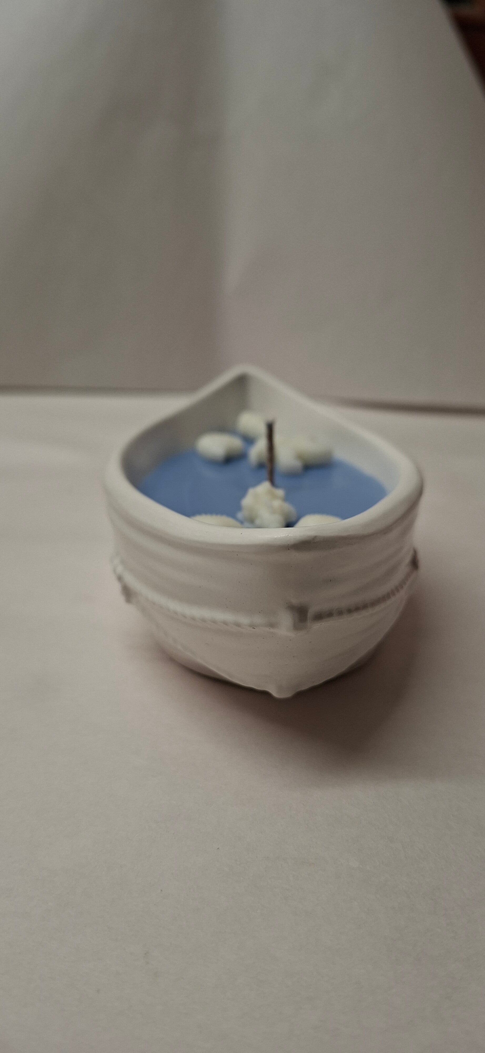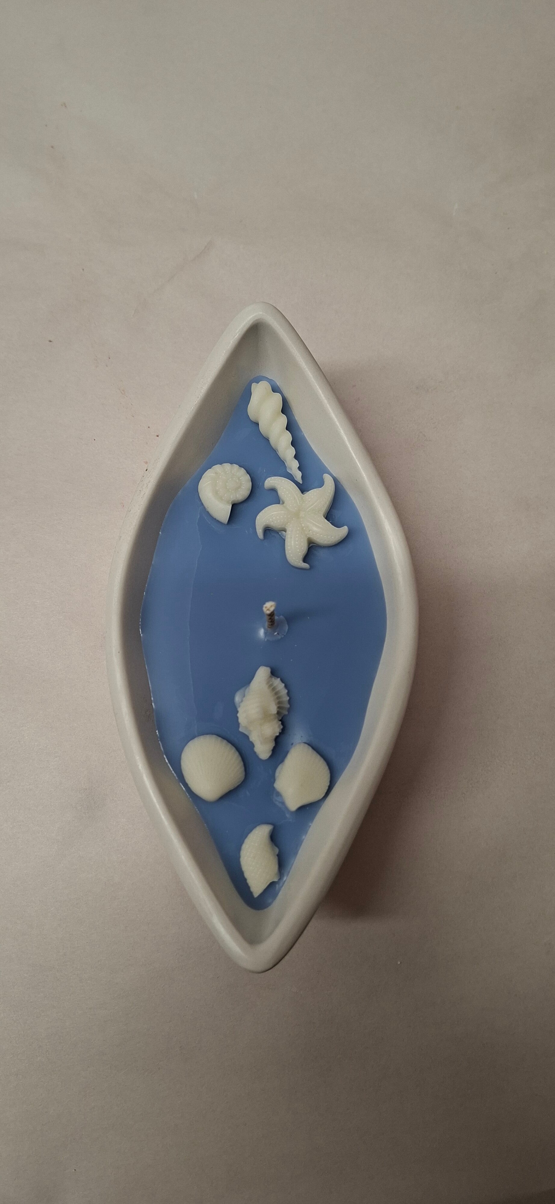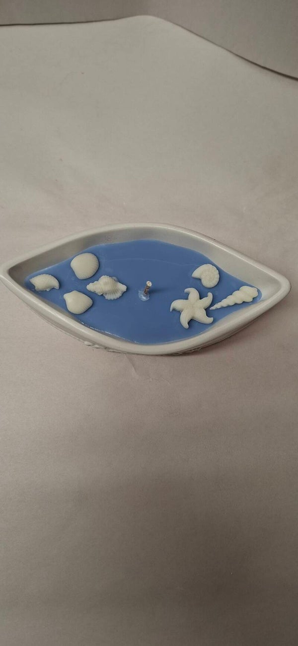 Die blaue Wachsfläche erinnert an ruhiges Wasser, während die hellen Details das Gefühl von Strand, Sonne und Meeresbrise aufgreifen. Dadurch wirkt die Kerze wie ein kleines Schiff, das über das Meer treibt – ruhig, sommerlich und dekorativ zugleich.